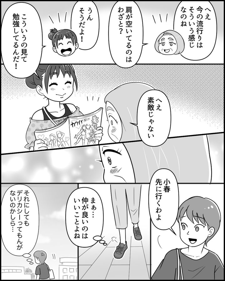 義母は孫のファッションに興味津々。ある日、「草むしりしてくる」と義母が言い出して、由美はやらせるわけにはいかないと後を追ったところ、娘の服を着た義母の姿が…!しかも娘に見られて…。