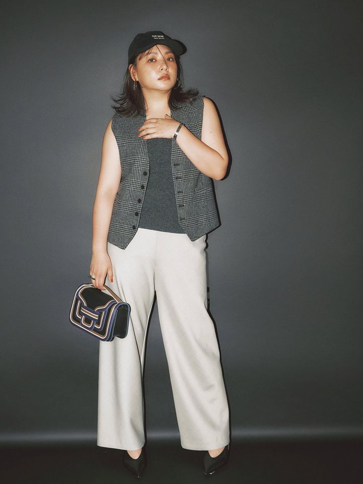 ピアス¥64,900(ホアキン・ベラオ)ベスト¥61,600(ユニオンランチ/リトルリーグ インク)タンクトップ¥6,270(ミラ オーウェン/ミラ オーウェン ルミネ新宿2店)パンツ¥24,200(セピエ/コラージュ ガリャルダガランテ 京王貨店 新宿店)バッグ¥209,000(ピエール アルディ/ピエール アルディ 東京)パンプス¥29,700(ドゥーブル/サロン アダム エ ロぺ)キャップ¥12,100(ザ ニュー ソサエティ/サードマガジン)リング¥79,200バングル¥96,800(ともにホアキン・ベラオ)