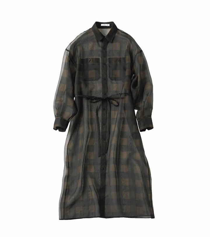 旬のチェック柄。シアーだから子供っぽくならず着こなせます。シアーワンピース¥71,500(ハイク/ボウルズ)