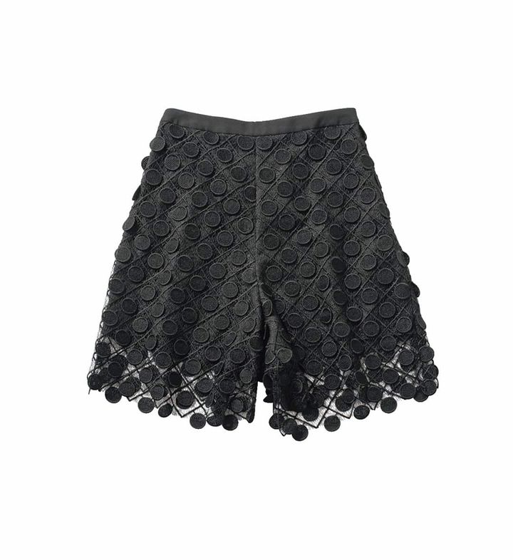 甘くなりすぎないドットモチーフのレースパンツ。ウエストは後ろゴム仕様。レースショートパンツ¥30,500(シーニュ)