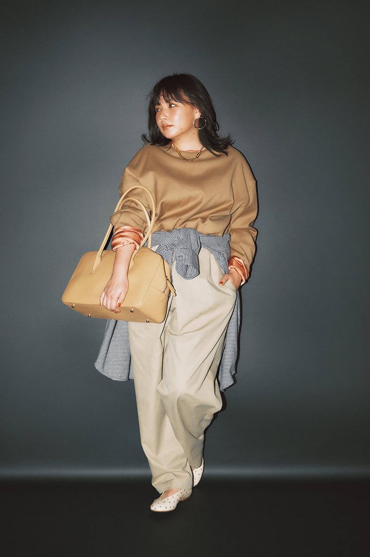 ピアス¥30,800(ブランイリス/ブランイリス トーキョー)トップス¥44,660(TELA/ティースクエアプレスルーム)タックパンツ¥35,200(ギャルリー・ヴィー/ギャルリー・ヴィー 丸内店)腰に巻いたシャツ¥44,000(インディビジュアライズドシャツ/サロン アダム エ ロぺ)バッグ¥66,000(パフト/アダム エ ロぺ)パンプス¥167,200(セルジオ ロッシ/セルジオ ロッシ カスタマーサービス)ネックレス¥154,000(ブランイリス/ブランイリス トーキョー)