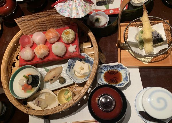 丸いかごに小さな和柄の傘が飾られて、華やかな手毬寿司が並んでます。ほんと“花かご”ですね! 煮物、焼き物、小鉢もあります。さらに、天婦羅と茶碗蒸しまで。 目で楽しみながら、美味しく味わって、ボリュームもあり・・・。 おなか一杯、大満足だったようです。