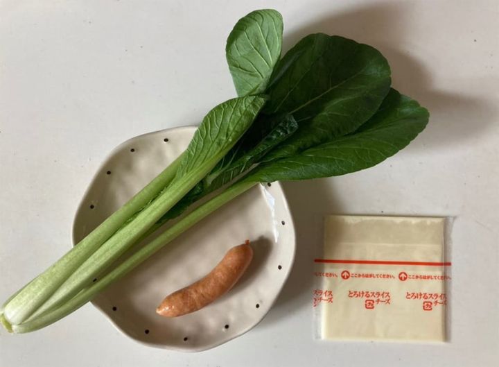 3. 小松菜とウインナーはキッチンばさみなどを使って食べやすい大きさに切る。スライスチーズは、手でちぎって生地に入れる。