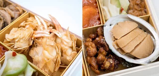 驚きの美味しさを詰め合わせた中国料理。鮑のオイスター煮 海藻添え、海老のチリソース煮、かに爪アーモンド揚げ、とびっこ翡翠蒸し、黒酢の酢豚、帆立醤油煮、烤麩(コウフ)の香味煮、くらげ甘酢和え、桃型餅など17品。