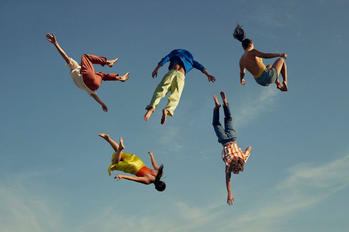 Friends in casuals falling in mid-air