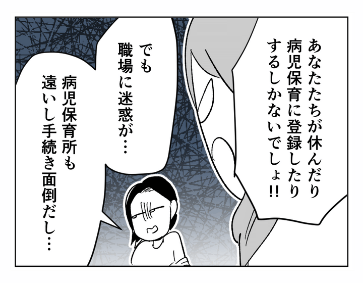 チサトさんの義妹・アヤさんは、フルタイムで働いています。しかしその息子・トウマくんは体調を崩して保育園を休みがち。アヤさんは、「仕事を休めない」と、いつもチサトさんに強引に預けて出社していきます。しかし、とあるきっかけで保育園を休んだトウマくんが親戚に預けられ、そこで面倒を見た親戚に「あの家はネグレクト」とうわさされます。アヤさんは「うわさを広めたのはお義姉さん!」と誤解してチサトさんの元へ。「たかがパート」と侮辱したことで、チサトさんから絶対に預からないと宣言されてしまいました。