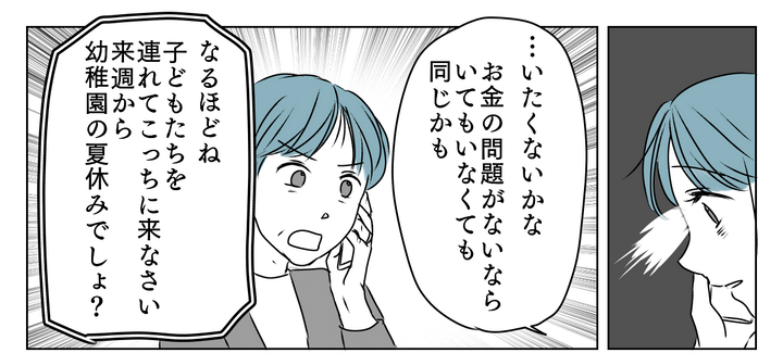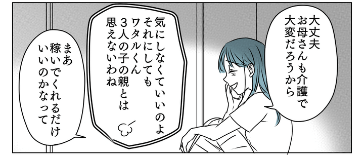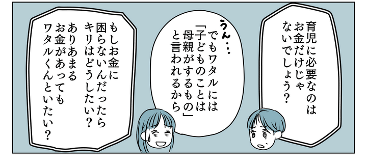 母に「ありあまるお金があってもワタルくんといたい?」と言われてはじめて、自分の気持ちに気づきました。お金の心配が一切ないとしたら、普段から家事も育児もしない夫とは一緒にはいたくありません。