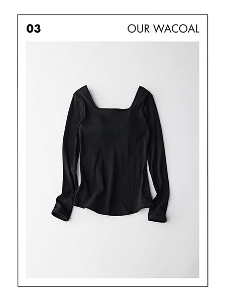 黒カップインスクエアネックロンT(ICBコラボ)/OUR WACOAL(ワコールお客様センター) 適度にハリがあるコットンリブ素材。カップつきのため1枚で完結。直線的なラインで首まわりをよりすっきり強調できる。