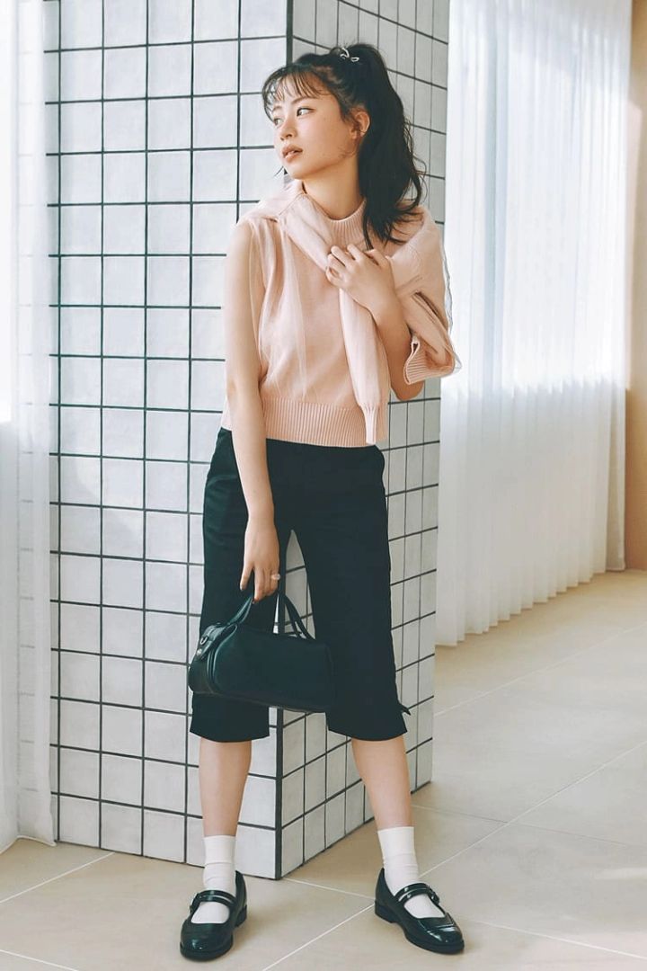 ノースリーブニットトップス 16,500円、肩かけしたカーディガン 19,800円/ともにHONEY MI HONEY カプリパンツ 11,660円/ASURA(HANA KOREA)ヘアピン 950円/NADIA FLORES EN EL CORAZON リング 5,500円/ミミサンジュウサン(サンポークリエイト)バッグ 40,100円/ルメンシューズ 9,900円/チャールズ&キース(チャールズ&キース ジャパン)ソックス/スタイリスト私物