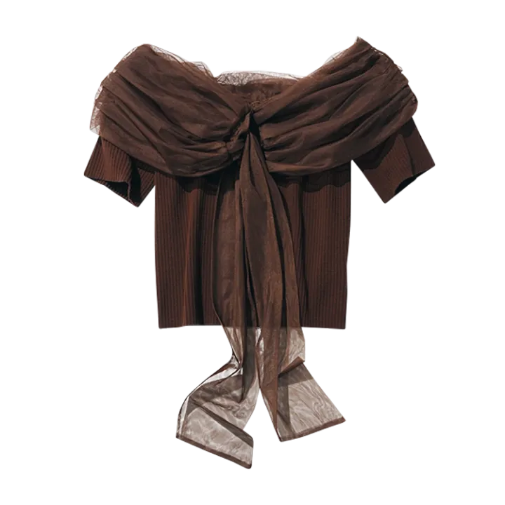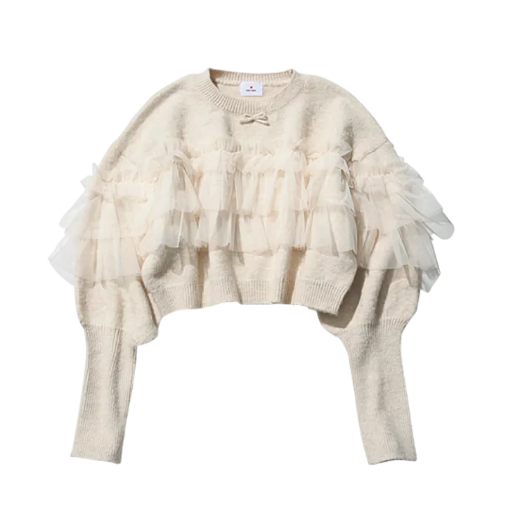 ニット×チュールの絶妙バランスが大人っぽいフェミニントップス。カーディガンを肩かけすることで脱ブナン。