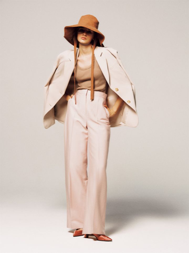 ワントーンスタイルの延長で、近しい色どうしを集めていく。たとえば、ベージュを基準に、同系色の浅いブラウンやピンクを混ぜ合わせると、地味でも派手でもない絶妙なさじ加減が出来上がり。多色づかいするときは、セットアップや先細パンプスでシルエットはとことん端正に。