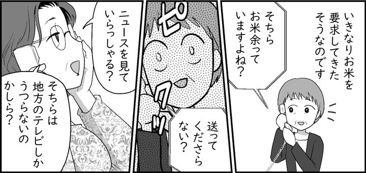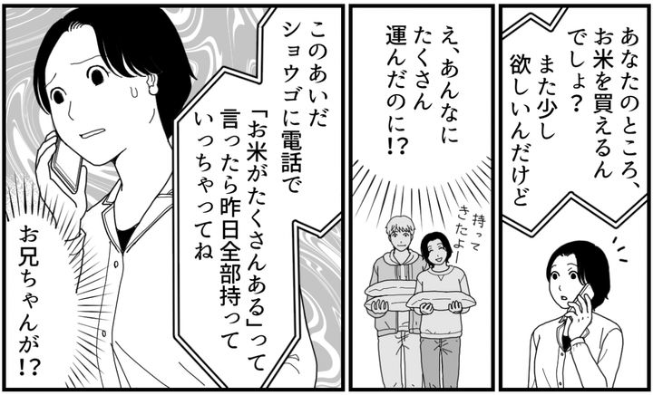 そんな折、お米が品薄になったタイミングで、信じられない出来事が。なんと義母が、絶縁状態のエリさんの実家に「お米を送ってほしい」と連絡してきたのです。母からその話を聞いたエリさんは呆然。