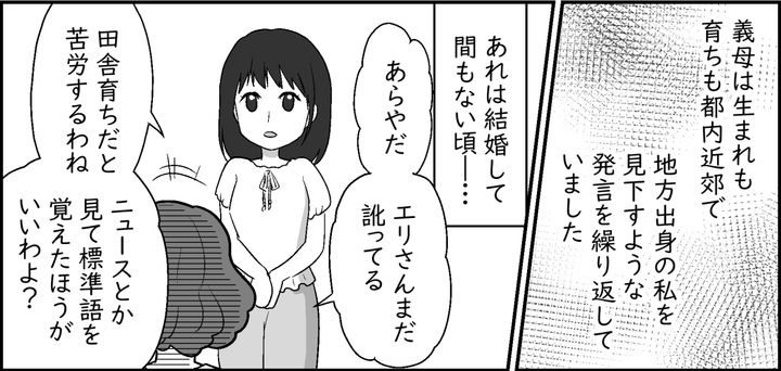 笑って受け流していたものの、両親までバカにされ、限界に達したエリさんは義母と距離を置くことに。