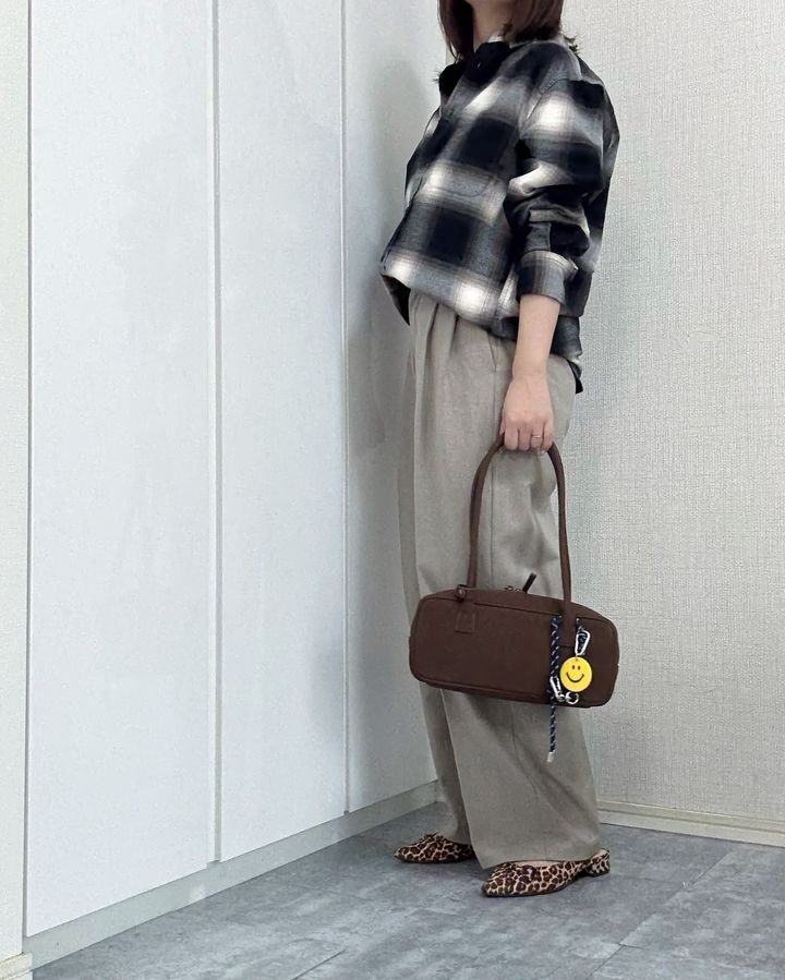 GUの「フランネルシャツ」2,490円(161cmでサイズL着用)のボタンを三つくらい開けて襟を抜き、後ろに抜いて着崩しているのがポイント。ボトムスにはGUのタックワイドパンツのやさしいベージュを選び、Iラインを意識したきれいめな印象をプラスしています。バッグや靴をブラウン系で揃えることで、統一感のある落ち着いた雰囲気を演出し、きれいめカジュアルに昇華させた、すぐに真似したい大人の着こなし術です。
