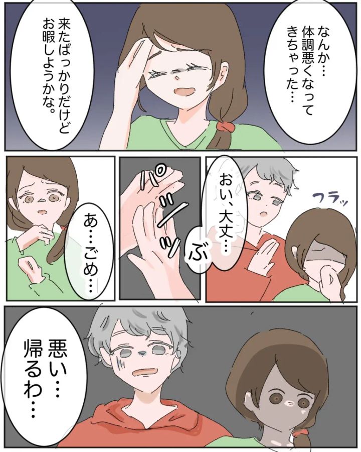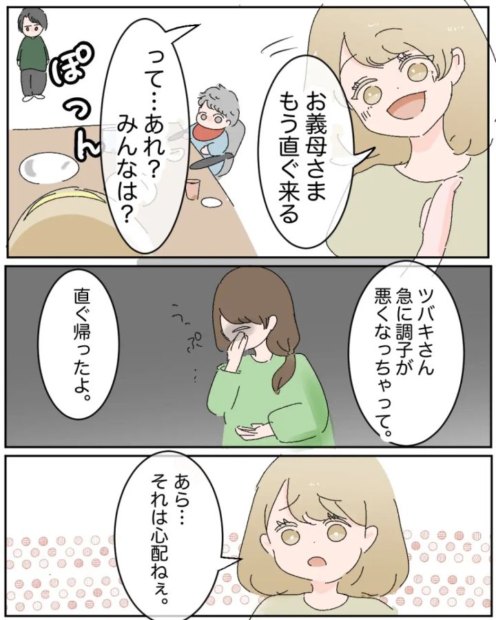 「なんか体調悪くなってきちゃった・・・来たばっかりだけどお暇しようかな」と真っ青な顔で言うツバキさん。ふらつく体を支えようと、ソウが背中に手を添えようとしますが、パシッと払われてしまいました。ツバキさんのただならぬ様子に何かを察したのか、ソウは「悪い、帰るわ・・・」と言い、ツバキさんと子どもたちを連れて帰っていきました。