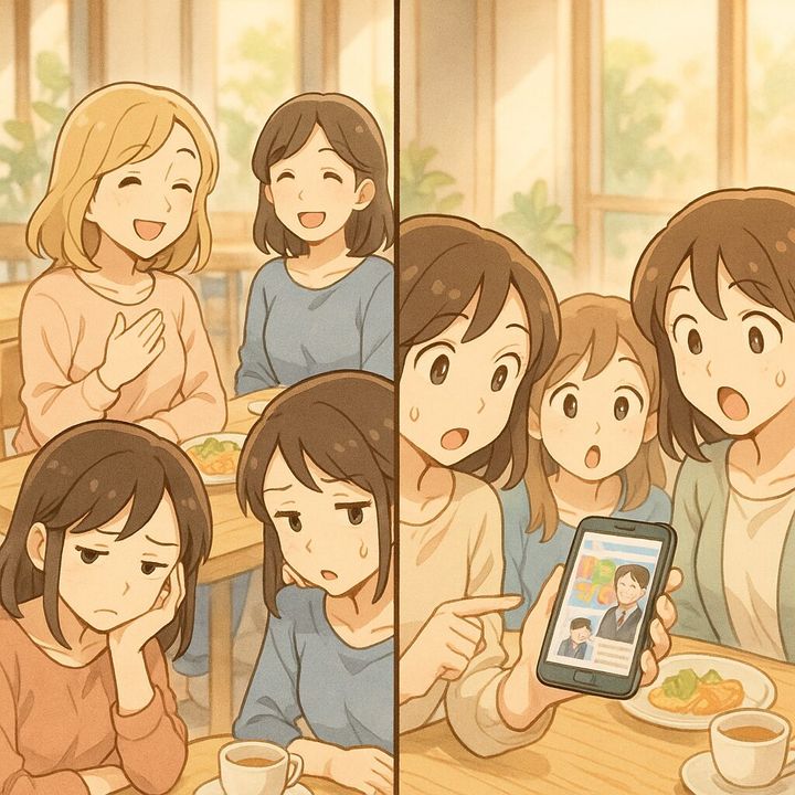 ランチ会の空気は一変し、皆がアプリの話題で大盛り上がり。伊藤さんは一言も話せなくなり、気まずそうに俯くだけでした。次のランチ会から、彼女の夫自慢がピタリと止んだのは言うまでもありません。