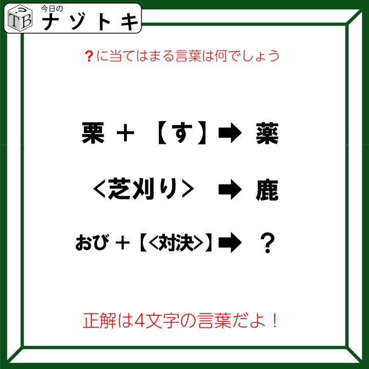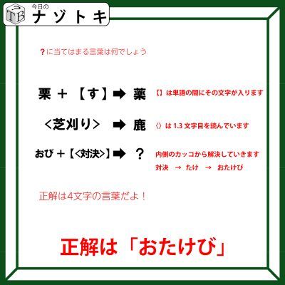 カッコに入った「対決(たいけつ)」を内側のカッコから順に適用させていきましょう。まずは<>なので「対決(たいけつ)」が「たけ」になります。そして【】の効果を適用させるので左にある「おび」の中に「たけ」を入れていきましょう。そうすると「おたけび」となります。