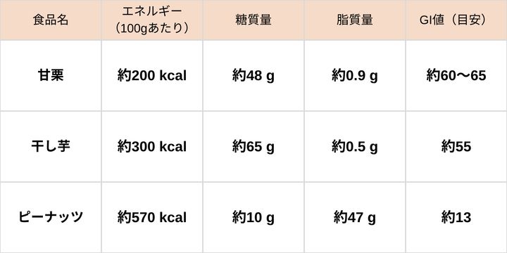 一方、ピーナッツは低GIで血糖コントロールには優れていますが、脂質が多いため食べすぎには注意が必要。干し芋はビタミンや食物繊維が豊富ですが、糖質が高いので量を控えるのがポイントです」