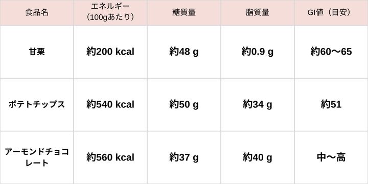 「甘栗はナッツのように脂質が多くなく、干し芋よりもカロリーが低めなので、“自然な甘さで満足感を得たい人”にぴったりの間食です。ただGI値はやや高め(60前後)ではあるものの、血糖値が急上昇しやすい“お菓子類”と比べれば緩やか。また、脂質を抑えつつエネルギー補給ができるので、運動前の軽いエネルギーチャージとしてもおすすめです。