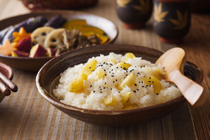 ①甘栗ときのこの炊き込みご飯(玄米ベース)