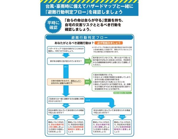 ①「避難行動判定フロー」を参考に、ハザードマップで、浸水想定エリア、避難場所などを確認