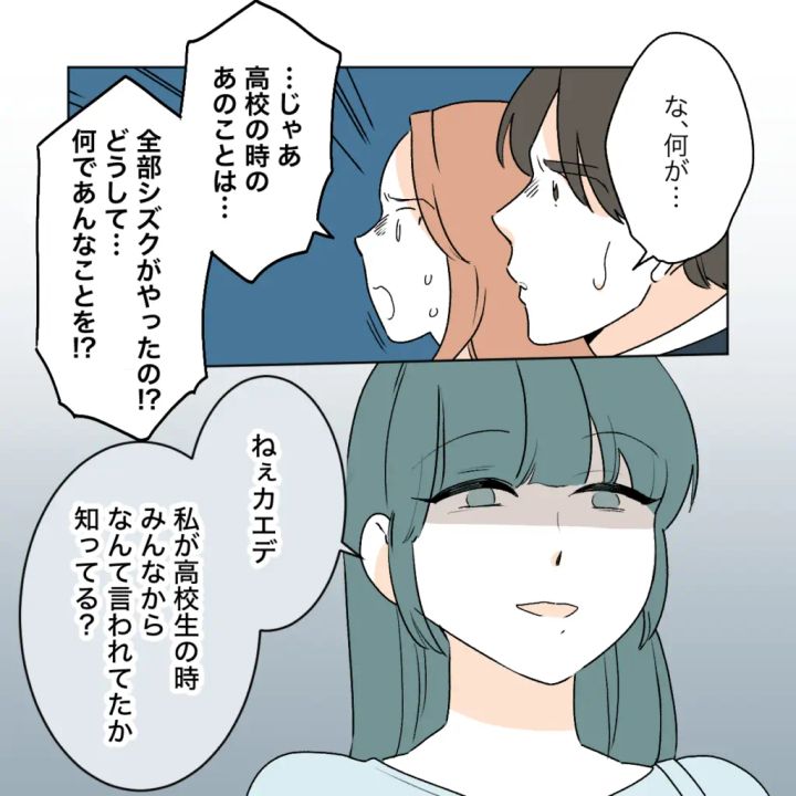 「じゃあ高校の時のあのことは・・・全部シズクがやったの!?どうしてあんなことを」カエデは必死に問いかけます。すると、シズクは口元を緩ませながら「ねぇカエデ、私が高校生の時、みんなからなんて言われてたか知ってる?」と聞きました。