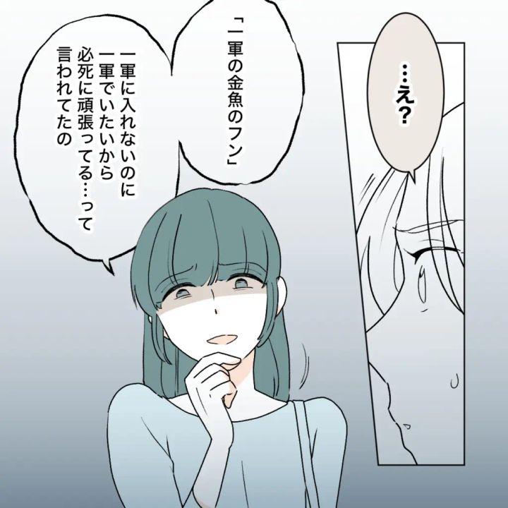 高校時代のことを急に掘り起こしたシズクに、カエデは「・・・え?」と聞き返します。するとシズクは顔を歪ませながら「一軍の金魚のフン、一軍に入れないのに一軍でいたいから必死に頑張ってる・・・って言われてたの」と言いました。