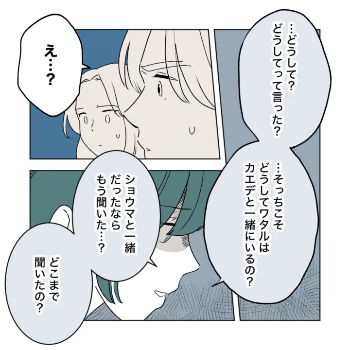 「どうしてって言った?・・・そっちこそどうしてワタルはカエデと一緒にいるの?」質問とズレた返答に、ワタルは思わず困惑した表情を浮かべます。「ショウマと一緒だったならもう聞いた?どこまで聞いたの?」と急に話し始めるシズク。