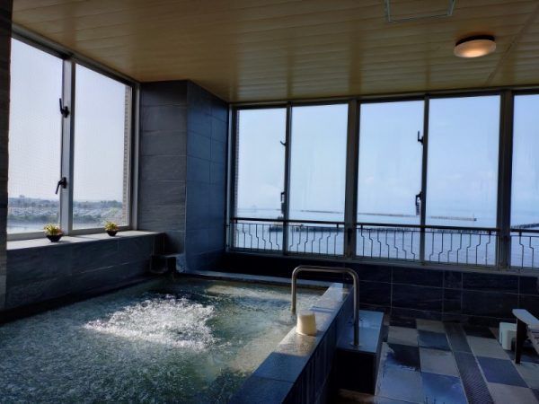 「リブマックスリゾート桜島シーフロント」さんといえば、やっぱり大浴場の展望。男湯と女湯が毎日入れ替わります。最上階にあり、入ると前面大きな窓に海、海、海。 展望浴場さくらじまの方は、桜島がどーん!