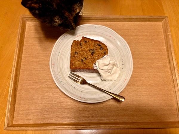 「キャロットケーキ」(450円) お店で提供しているように、ギリシャヨーグルトを添えていただきました。 北海道産有機ハルユタカ(石臼引き全粒粉)、有機人参、スパイスの風味に加えて、クルミやココナッツの食感が楽しい。 ギリシャヨーグルトと一緒に食べると酸味が加わって、素朴な甘みが引き立ちます。 スパイスの香りに誘われて、我が家のにゃんこが近づいてきちゃいました。