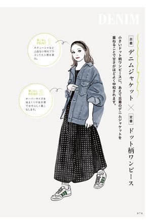 本書で提案されているのは、全身を古着でそろえるスタイルではなく、手持ちの定番服に古着を1点プラスする「古着ミックスコーデ」。たとえば、小さいドット柄ワンピースに古着のデニムジャケットを重ねたり、レーススカートに古着のデニムパンツをレイヤードさせたり。このシンプルな工夫が、無難になりがちなおしゃれの悩みを軽やかに解決してくれます。古着ならではの一点ものの魅力で、人とかぶらない自分だけのスタイルが実現し、大人のこなれ感も自然に手に入ります。