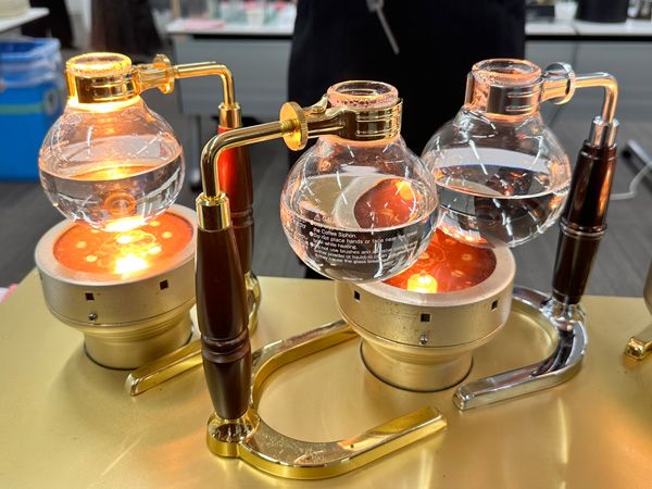 次はいよいよ、待ちに待った抽出体験。会場後方にずらりと並んだサイフォンの装置は圧巻!