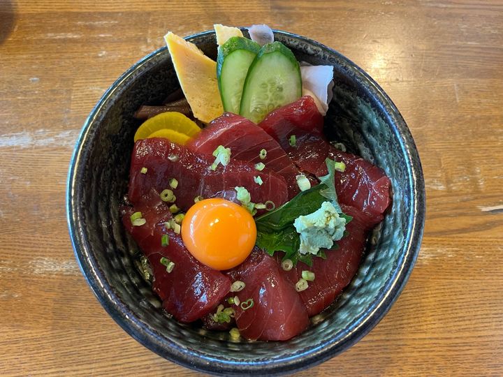 迷った結果、マグロ落とし漬け丼 黄身のせをお願いすることにしました。名前を聞いただけで美味しい。笑