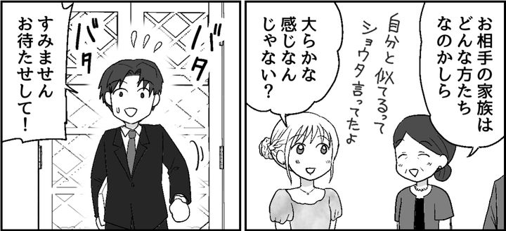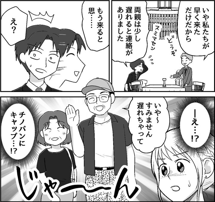 なんとショウタのご両親は、チノパンにキャップといった格好で現れたのです! 私たち家族はきちんと、顔合わせの場にふさわしいフォーマルな服装を選んでいました。ショウタもさすがにちょっと呆れた様子です。