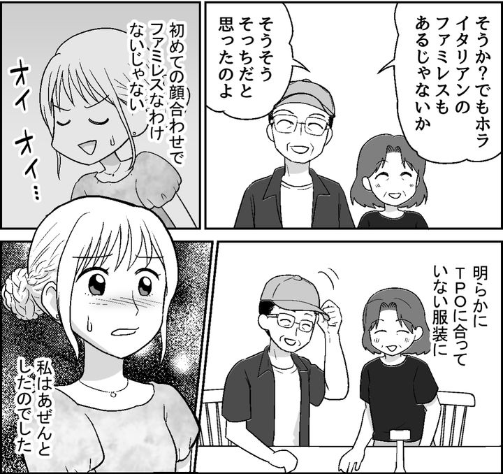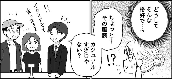 ちょっといいイタリアンレストランを予約して、お互いの両親に会ってもらうことにした私たち。結婚への道を進みはじめた気がして私はとても嬉しかったです。しかし約束の場に現れたショウタのご両親は、とてもラフな格好で……。TPOを考えられないような彼のご両親を見て、私はあぜんとしてしまったのでした。