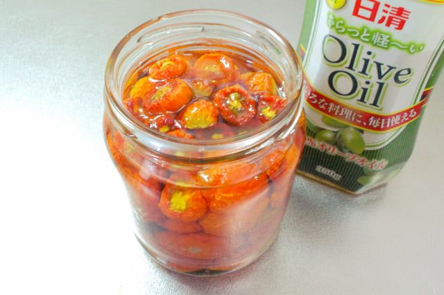 ひと晩漬けて仕上げた「セミドライトマトのオイル漬け」がこちらです。オリーブオイルにトマトの色が付くのかと思いきや、漬けた直後と見た目は変わりませんでした。