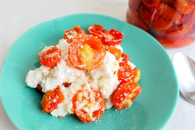 材料は2人分で「セミドライトマトのオイル漬け」50gとそのオイルを適量、カッテージチーズ50g、塩はお好みで。