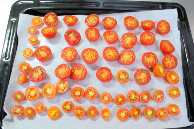 トマトの水分が飛ぶように切り口を上にして並べます。あとは100℃に予熱したオーブンに入れるだけ。加熱時間は2時間ですが、オーブンにお任せなので、焼き上がるまで他にやるべきことはありませんでした。