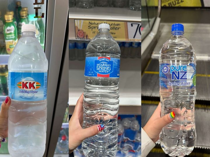 左からマレーシア、ニューヨーク、ニュージーランドのペットボトルのお水