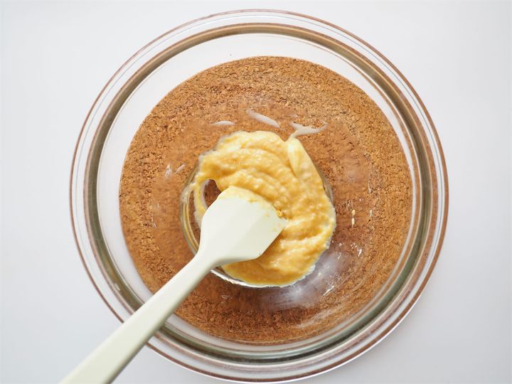2. キッチンペーパーで豆腐の水を軽くとり、1のボウルに入れなめらかになるまで混ぜていく。