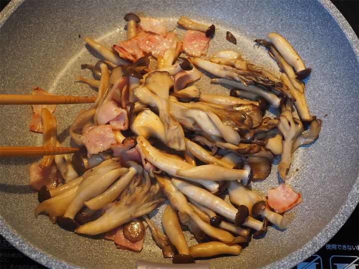 6. きのこから染みでた水分が飛ぶ程度に炒めたら端に寄せ、空いたスペースでベーコンを炒めていく。ベーコンに軽く焼き色がつく程度に炒めたら、しょうゆ(分量外)小さじ1程度入れ、全体を混ぜ合わせさらに炒める。