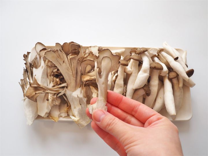 3. 舞茸を食べやすいサイズに割き、しめじの石づきを切り落としておく。