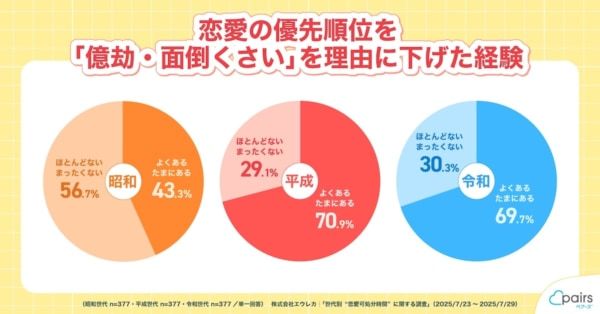 実際、これを裏付けるように「恋愛の優先順位を、億劫・面倒くさいという理由で下げた経験」について尋ねたところ、平成・令和世代は「経験がある」と回答した人が約70%であるのに対して、昭和世代は43.3%と半数以下にとどまります。