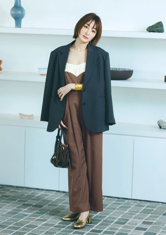 ジャケット¥12,980/CITEN(ユナイテッドアローズ) オールインワン¥38,500/COEL(ビッグヒット) ピアス ¥28,380、バングル¥61,600/ともにソコ(ズットホリック) ネックレス¥2,640/アプロ(ロードス) バッグ¥39,600/メアリ オル ターナ(AL Design Inc.) パンプス¥17,600/ダイアナ(ダイアナ 銀座本店)