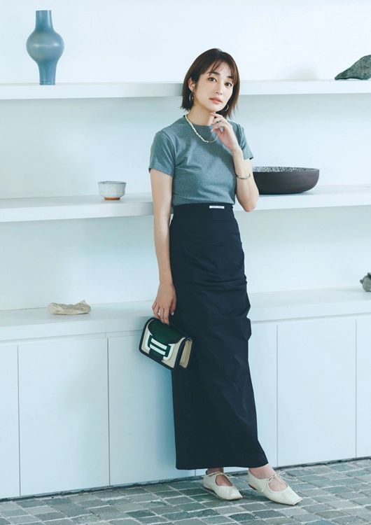 あえてメリハリをつけず、全身で縦のラインを強調して都会的な装いへ。ボディラインにフィットしすぎるとセクシーに傾きがちなので、ストレートシルエットを意識してあくまでシャープに。