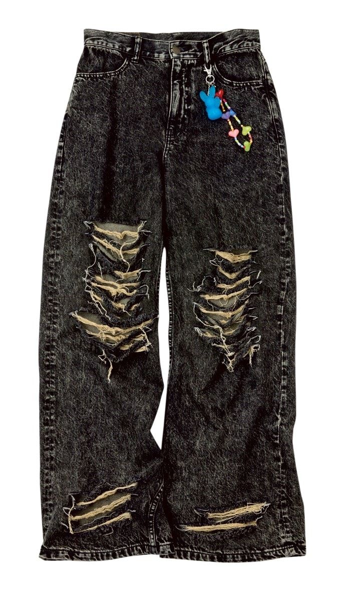 【上から】スウィートなイチゴプリントもビンテージなムードでロックに。Tシャツ¥6,050、腰ベルトにうさぎつきのチャームをつけてインパクトを♡ デニムパンツ¥15,400、デニムにつけたチャーム¥3,080、ロゴ入りがキュート。ソックス¥1,980/以上すべてX-girl(X-girl store)