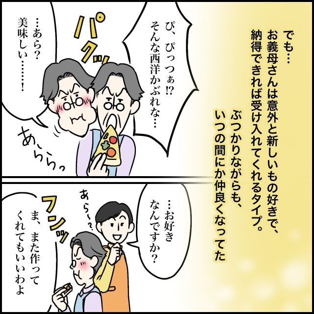 「ぴ、ぴっつぁ!?そんな西洋かぶれな・・」そう言いながらもパクっと一口食べると、「・・あら?美味しい・・!」とビックリ!「あら~?・・お好きなんですか?」と言うと、「フンッ!ま、また作ってくれてもいいわよ」と頬を赤くしながら答える義母が可愛く思えたりも。
