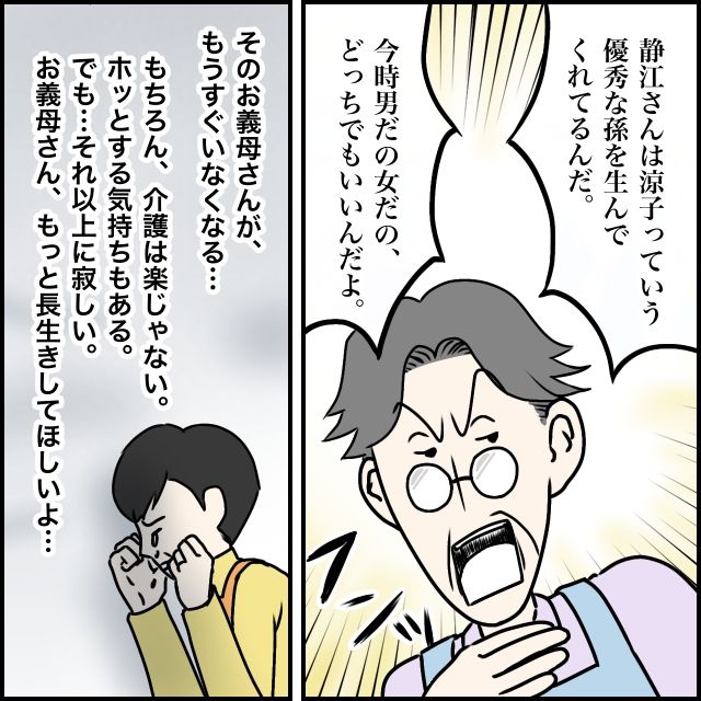 「静江さんは涼子っていう優秀な孫を生んでくれてるんだ。今時男だの女だの、どっちでもいいんだよ。フンッ」と義母が言ってくれ救われた気分になったのです。