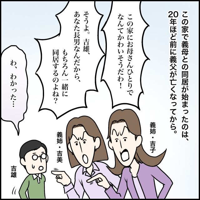 「この家にお母さんひとりでなんてかわいそうだわ!」「そうよ吉雄。あなた長男なんだから、もちろん一緒に同居するのよね?」二人の義姉に詰め寄られ、「わ、わかった・・」と呟いた夫。