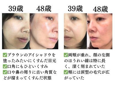 また、目元や口角がひどくくすんでいたので、淡い色のアイシャドウやリップは使えませんでした。さらに、頬がたるみ、今よりもかなり低い位置に頬のトップがあり、ほうれい線も長く深く刻まれていました。